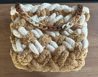 Borsa chunky artigianale fatta a mano, realizzata con filato morbido nei colori panna e caramello che creano un effetto caldo ed elegante.