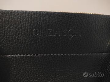 Borsa di Cinzia Soft in vera pelle, nera con dettagli color oro. Ha due scomparti interni capienti più uno centrale più piccolo con cerniera. Dimensioni 34 cm L per 28 cm H