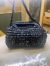 Borsa clack fatra a mano con ferriccia nera e filo argemto con manico e tracolla