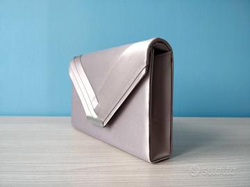 Borsa clutch In tessuto Colore tortora Tracolla in metallo colore argento Chiusura a calamita Taschina interna Dimensioni: Larghezza 21 cm Altezza 13,5 cm Profondità 4 cm