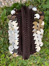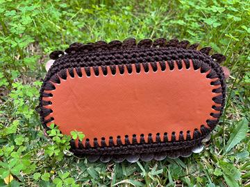 Borsa clutch in cordino e paillettes, con fondo in ecopelle realizzata a uncinetto