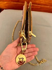 Leggera e versatile, può essere portata a mano oppure indossata a spalla grazie alla tracolla con catena dorata, per un look sempre curato. L’interno foderato, accessibile tramite due chiusure con zip, è dotato di uno scomparto centrale funzionale, con una pratica tasca con zip e due tasche aperte, perfette per organizzare gli oggetti essenziali.