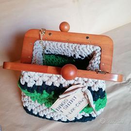 Borsa clutch uncinetto, in fettuccia di lycra, fatto a mano, chiusura in legno clic clac, tracolla in metallo. Altezza cm 16,larghezza cm 19