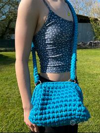 Borsa clutch turchese creata a mano all'uncinetto, con lunga tracolla removibile.