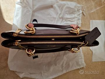Borsa a mano o a tracolla della Coach, modello Mini Brooke Carryall, F26143. Viola scurissimo, praticamente testa di moro, con dettagli in rosa. Pelle a grana incrociata e pelle con goffratura esotica. Varie tasche interne. Chiusura a scatto, fodera in tessuto. Scomparti laterali con cerniera. Con manici tipo pitonati colore rosa. Tracolla rimovibile per essere indossata a spalla o a tracolla. Borsa nuova, mai utilizzata. Sacca anti polvere originale Coach. Ancora con bustine e manuale per la cura della pelle. Dimensioni: circa 21 x 30 cm. Profondità: circa 9 cm. Purtroppo Subito mi fa caricare solo sei foto. Molte altre foto disponibili su richiesta, si prega di contattare.