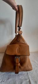 Borsa in pelle martellata Coccinelle, a spalla, con taschine laterali. Interno in raso di seta carta da zucchero. Misure 24×20.
