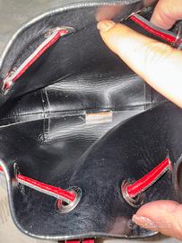 Chiusura con laccetto scorrevole attraverso occhielli metallici color argento.