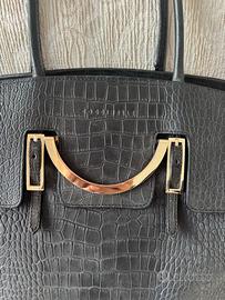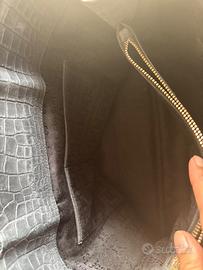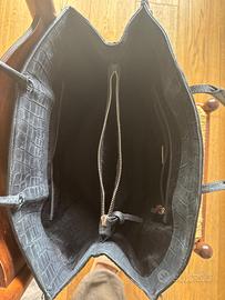 Colore blu con inserti metallici due scompartimenti interni e un terzo con chiusa lampo. Due tasche interne più una con lampo misura borsa 38,5 altezza 33 profondità 12 ottima come porta pc