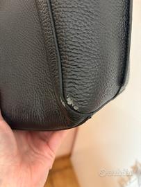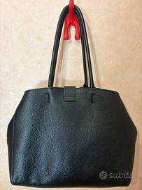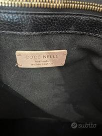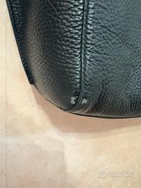 Borsa a spalla Coccinelle, nera in vera pelle. Si chiude con un bottone automatico. Grande, spaziosa, con 2 scomparti al centro dei quali ce n’è un altro chiuso con la zip. Ha dei piccolini segni su un lato, ma tenuta in ottime condizioni. Completa di dustbag.