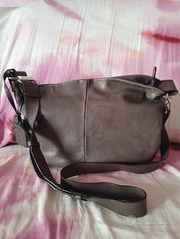 Borsa Coccinelle in pelle, con tracolla lunga e regolabile, colore grigio scuro.