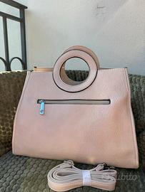 Dal design elegante e femminile, questa borsa beige chiaro si distingue per il manico rotondo impreziosito da piccole borchie brillanti, che dona un tocco sofisticato al look.