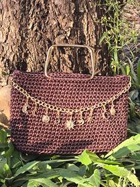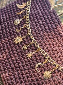 Accessori: ciondoli sole e luna oro, catenella oro, manici rettandolari oro, fondo ovale in cordino.