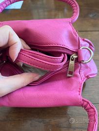 Borsa fucsia con fiore, non molto grande e com possibilità di tracolla. MAI USATA