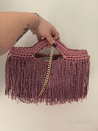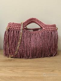 Borsa con frange interamente fatta a mano, molto capiente. Dotata di catena removibile per essere utilizzata anche a tracolla. Nuova, mai usata