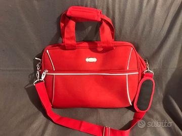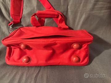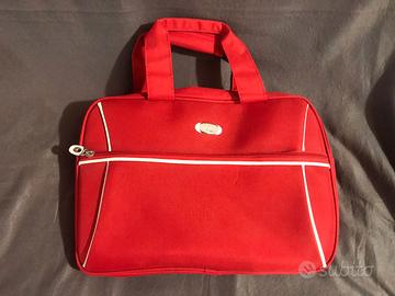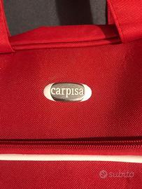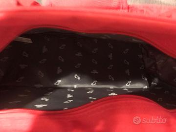 Borsa Carpisa in tela impermeabile rossa con alcune profilature bianche chiusura superiore a vano unico + vano a tasca frontale e fascia posteriore per innesto a trolley, due manici e tracolla con borchie di appoggio sottostanti. Ideale per PC e documenti. mai usata come nuova
