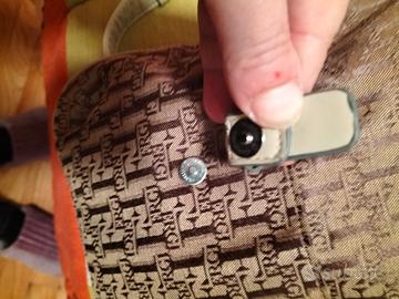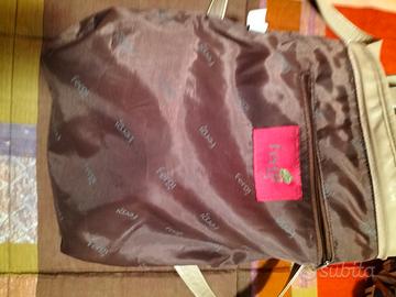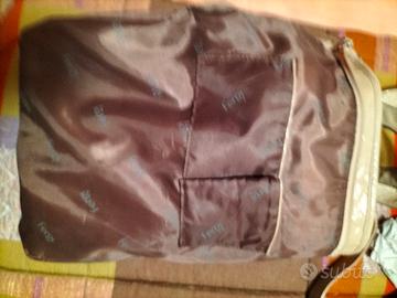 Grandi dimensioni e capienza.L'interno come potete vedere dalle foto e' in perfette condizioni; ha una tasca con cerniera ed altre due più piccole. Unico difetto e' in una delle due chiusure della tasca esterna dove manca il rotondino di chiusura (vedi foto 6).