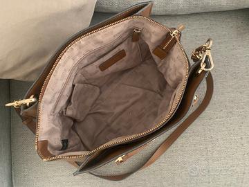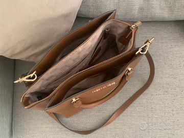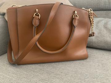 Borsa a spalla con maniglie e tracolla, praticamente quasi mai usata, color cuoio e con rifiniture in oro.