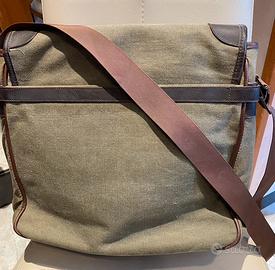 Borsa in tela verde militare con tracolla dotata di doppia tasca interna di cui una con cerniera, tasca esterna anteriore con cerniera e tasca posteriore con bottone a clip.