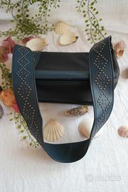 Bella borsetta con tracolla bella larga.In blu e nero con borchiette in metallo a creare fini disegni giometrici.Mai usata è in perfetto stato.