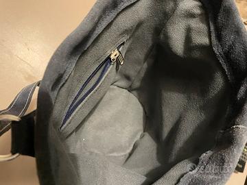 È confezionata in pelle di camoscio color carta zucchero, con interno foderato in scamosciato coordinato, taschina interna con chiusura zip e doppio manico lungo fissato con anelli metallici.