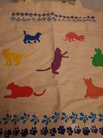 Decorata con gatti multicolore in diverse pose e motivi con zampette e foglie.