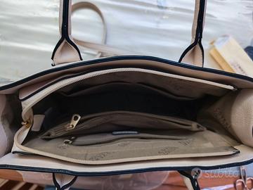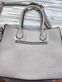 Borsa Coveri colore panna. Le rifiniture nere dei mani sono parzialmente rovinati, come da foto,mentre ta restante borsa è in perfette condizioni. Misure: lunghezza cm 34, altezza senza manici cm 27, larghezza cm 14.