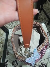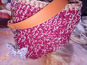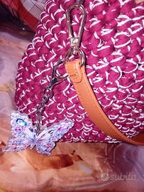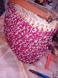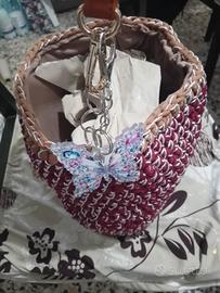 borsa in fettuccia realizzata interamente all'uncinetto, base rigida, manico rimovibile, ciondolo che può essere usato come portachiavi, interamente è rivestita