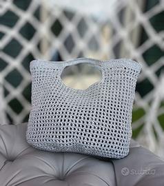 borsa rete realizzata all'uncinetto con cordino lurex colore argento.