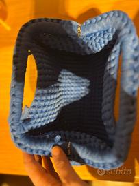 Vendo borsetta a mano fatta a mano in materiale crochet colore blu elettrico. Dimensioni: 30*17*15 (una volta aperti i manici).