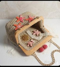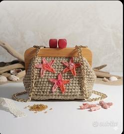 Porta con te il fascino del mare con l'esclusiva Summer Star Clutch, una creazione interamente fatta a mano che unisce l'eleganza del design artigianale a un'anima marina e sognante. Realizzata con tecnica crochet di alta qualità, questa borsa presenta un corpo compatto color sabbia, impreziosito da applicazioni di stelle marine sfumate sui toni del rosa e dell'arancio. La chiusura a scatto in pregiato legno naturale e la tracolla a catena dorata la rendono l'accessorio perfetto per l'estate o per un evento speciale. Dettagli del prodotto: Materiale: Filato crochet di alta qualità e chiusura in legno naturale. Dettagli: Applicazioni artigianali a forma di stella marina. Accessori: Tracolla a catena dorata inclusa. Condizioni: Nuovo, pezzo unico realizzato a mano in Italia. Misure indicative: Larghezza: 22 cm Altezza: 18 cm Profondità: 8 cm I nostri prezzi sono studiati per offrirti la massima qualità artigianale. Scegliendo Simonami Crochet, sostieni il valore del vero fatto a mano in Italia.