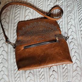 Vendo bellissima borsa a tracolla in ecopelle di alta qualità color cuoio, caratterizzata da un elegante motivo a borchie sulla patta frontale. Estremamente funzionale grazie ai suoi numerosi scomparti, ampia tasca principale con chiusura a zip e comparti interni .Chiusura a patta con bottoni magnetici invisibili.Tracolla regolabile e removibile. Base 25x11,5 cm. h16cm.
