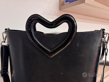 Borsa in pelle nera, misura cm32x 24, tracolla nero lucido regolabile, sacca interna, manico a forma di cuore.