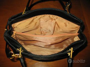 Borsa da Donna, con manici e cinghia a spalla in pelle, cucita in tessuto e pelle di colore nero con disegni a quadrifoglio, con interno foderato tinta senape e varie tasche porta oggetti, tutte le chiusure a cerniera, marca “David Jones”, ottime condizioni, mai usata, vendo a 30 Euro + 10,30 euro di spedizione postale con pacco ordinario tracciabile, solo in ambito nazionale, non tramite corrieri, pagamento con bonifico o direttamente in contanti. Astenersi indecisi e perditempo.