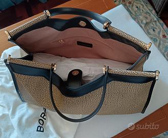 Borsa mai usata, in pelle con tinteggiatura colore beige si sfondo nero.