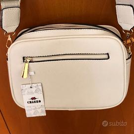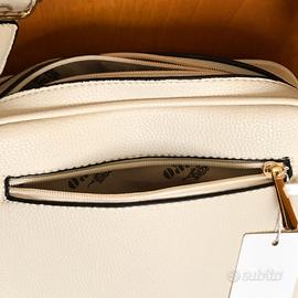 tracolla regolabile, ha una tasca esterna da un lato e dall'altro una sezione con cerniera. Lunga cm 25, alta cm 20 e profonda cm 9 più altra sezione con cerniera. Condizione: Nuova con etichetta. Se abiti in zona lo scambio può essere fatto a mano.