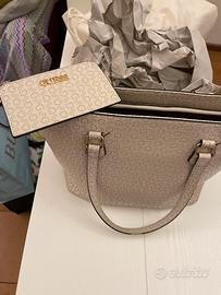 molto bella colore beige, chiusura con cerniera a zip, presa due manici da 25 cm, finiture in metallo, in aggiunta borsellino della stessa marca e dello stesso colore, scomparto principale molto spazioso adatto per documenti , scomparto per il cellulare, 2 scomparti per altro, uno con cerniera.