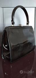 Borsa da donna in cavallino da un lato, effetto vernice dall’altro, colore nero, vintage, fine anni ’50, con scomparti interni, foderata internamente, usata ma in ottime condizioni