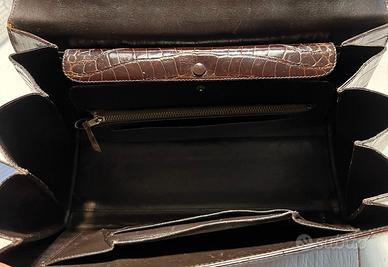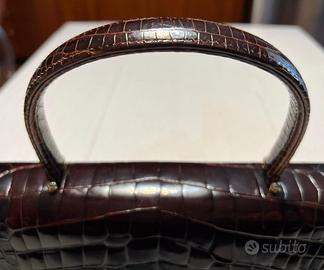 Un autentico pezzo di storia della moda. Splendida borsa vintage anni '60 in vera pelle di coccodrillo, color testa di moro, dal fascino classico e intramontabile. Dotata di manico rigido e fibbia dorata che aggiungono un tocco di raffinatezza e carattere.