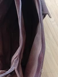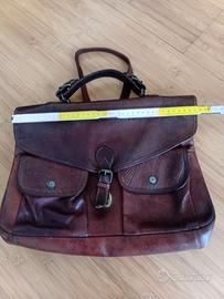 Borsa da lavoro in cuoio confezionata da un artigiano, 2 tasche esterne con bottone ed una interna con cerniera; manico e tracolla., due scomparti interni per fogli/cartelline formato A4