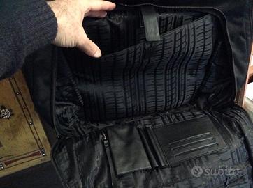 Borsa da lavoro Pirelli in tessuto e pelle, con rinforzi in gomma che richiama il disegno dei pneumatici.