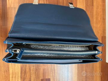 Cartella Prada in pelle finitura Saffiano colore blu baltico, con finiture e manico in pelle, chiusure in silver; sul retro tasca esterna a fessura: la valigetta ha una chiusura con patta e chiusura chiusura con combinazione, l’interno è in pelle ci sono tre grandi scomparti, con due tasche con cerniera utile borsa porta documenti o porta tablet. La borsa è corredata di dustbag Prada. Lunghezza 43 cm; Altezza 32 cm; Larghezza 15 cm; Condizioni Generali: Ottime; Esterne: Ottime. Interne: Ottime e Pulita.Si tratta di un prodotto usato, anche se le condizioni sono delle migliori, è sempre un prodotto acquistato e utilizzato da qualcuno, i segni più o meno evidenti lo dimostrano.
