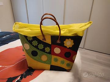 Borsa da mare rigida in paglia colorata, richiudibile con coulisse e doppi manici in similpelle.