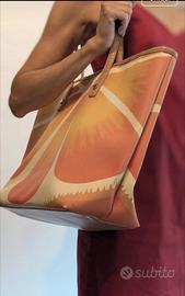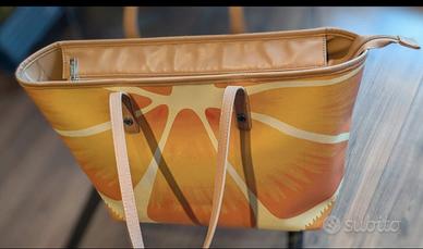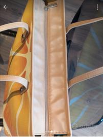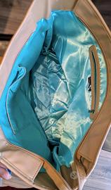 Borsa a spalla da mare o da viaggio in similpelle Caleidos. Chiusura completa con cerniera, 3 tasche interne di varia dimensione (1 con cerniera), fondo rigido. Interno con fodera colore verde acqua. In ottime condizioni; qualche lieve segno di utilizzo (vedi ultima foto - punti scoloriti). Dimensioni: larghezza parte alta: circa 51 cm; larghezza fondo: circa 38 cm; altezza 32 cm.
