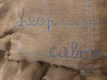 Borsa di stoffa modello a caramella con rouge, esterno tessuto beige spina di pesce con riga sottile azzurra, interno in cotone azzurro, con polsiera dello stesso tessuto e possibilità di aggiungere tracolla, fatta a mano. Dimensione 16 x 20 cm esclusa la rouge di 6,5 cm. Scritta (keep calm) ricamata a mano in azzurro.