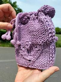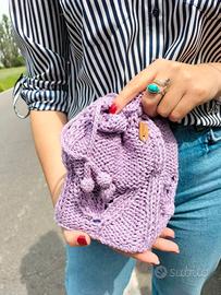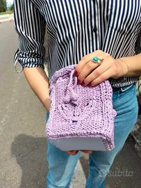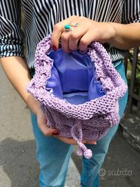 Piccola borsa fatta a mano a maglia con filato in puro cotone color lilla. Su ognuna delle quattro facciate è stato realizzato un motivo a foglie e fiore tridimensionale. Fondo bianco con impunture sul perimetro in cotone lilla fatte all'uncinetto. Fodera in raso cucita a mano. Interno con fondo rinforzato e laterali semirigidi. Chiusura con coulisse (cordino realizzato con lo stesso cotone della borsetta con finali a forma di sfera fatti all'uncinetto): una volta stretto il cordoncino diventa l'impugnatura della borsa. A causa dei diversi dispositivi il colore potrebbe risultare leggermente differente dal vivo.