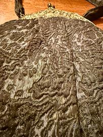 Rarissima Borsa “minaudiere” da sera in tessuto broccato nero e chiusura in argento. Misure 28 x 29. impeccabili condizioni. Primi del 1900. effettuo accurata spedizione.