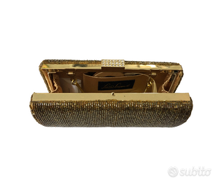 Vendo raffinata clutch da sera originale Luisa Spagnoli, in un luminoso color oro con preziosa fibbia gioiello frontale che la rende un vero e proprio accessorio protagonista.