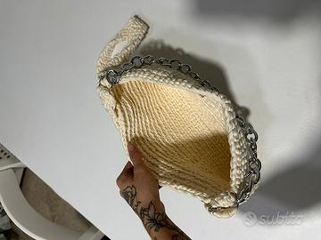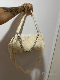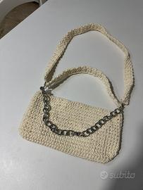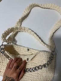 Borsa da spalla e tracolla ad uncinetto, la tracolla è removibile. Dettagli della borsa in color argento.