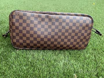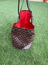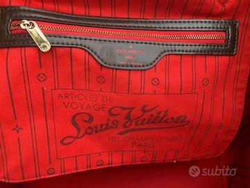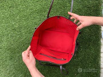 Vendo borsa Louis Vuitton, fodera in tessuto rosso a righe, parti metalliche dorate, quattro laccetti laterali, chiusura con gancetto, tasca piatta interna in tessuto a righe con zip, manico semplice x2 che consente di portarla a spalla o al braccio. 40 x 30 x 18 (Lunghezza x Altezza x Larghezza)