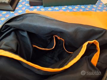 comoda e capiente borsa Campo Marzio, in tessuto impermeabile grigio antracite con inserti in pelle nera, da portare a mano o a tracolla, ampio spazio interno, grande tasca laterale e altre più piccole, fodera interna nuova, presenti segni di usura agli angoli parte bassa.nrl complesso è un ottima borsa, con la sua custodia.